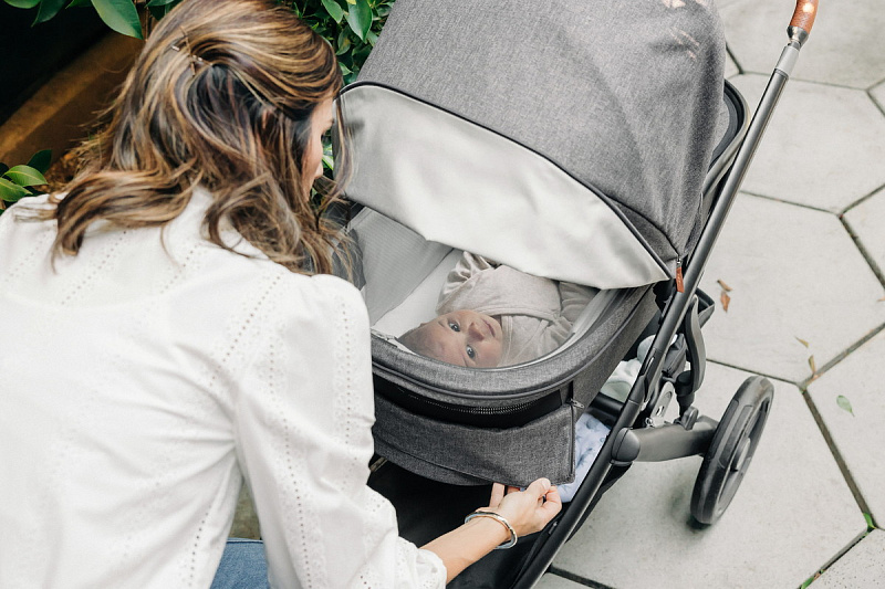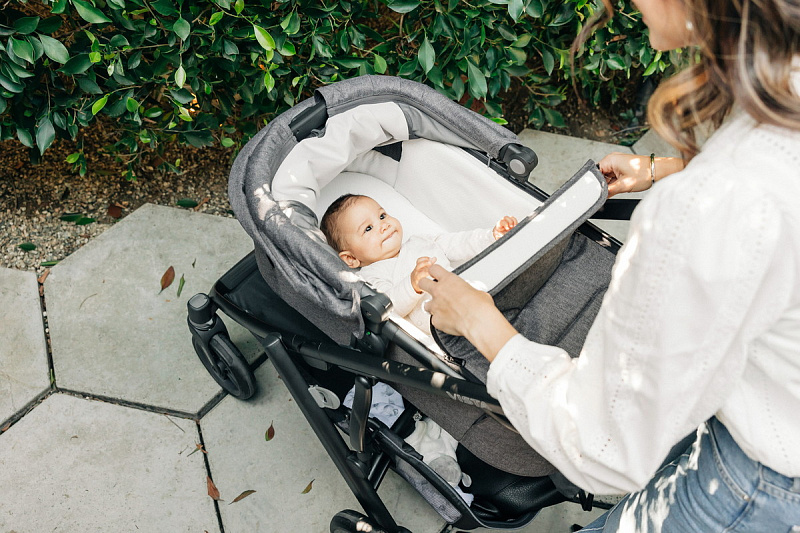 - Защита от солнца: Капюшон оснащен выдвижным козырьком с вентиляционными вставками, который обеспечивает надежную защиту от солнца и ультрафиолета UPF 50+, ветра и других неблагоприятных погодных условий.
