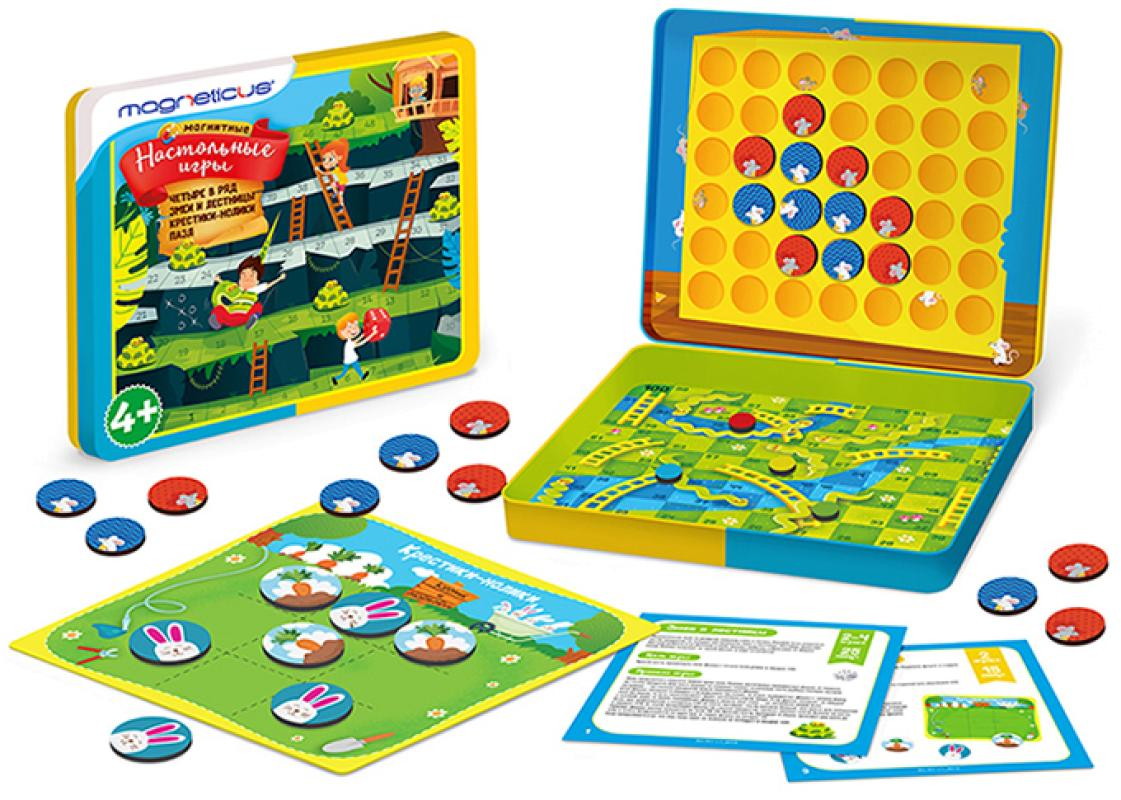 Магнитные настольные игры Magneticus 4 в 1 змейки-лесенки, четыре в ряд, крестики-нолики, пазл 4+