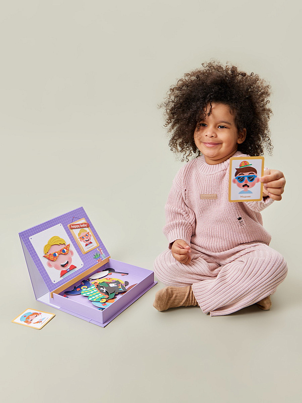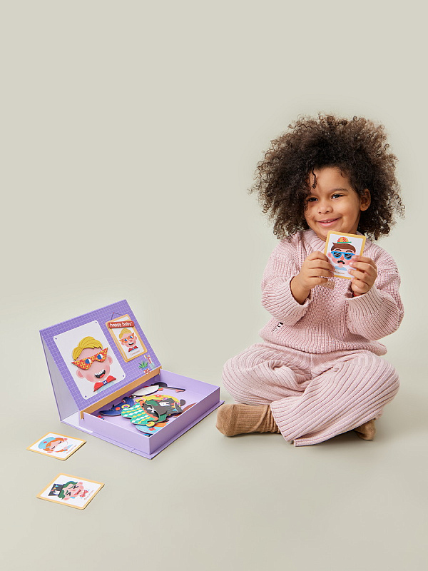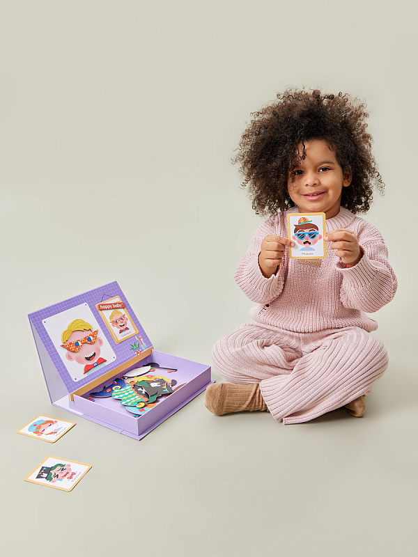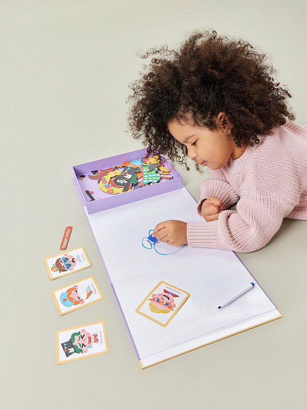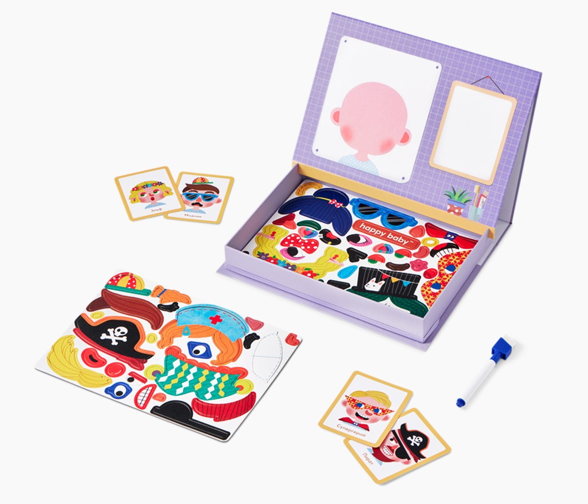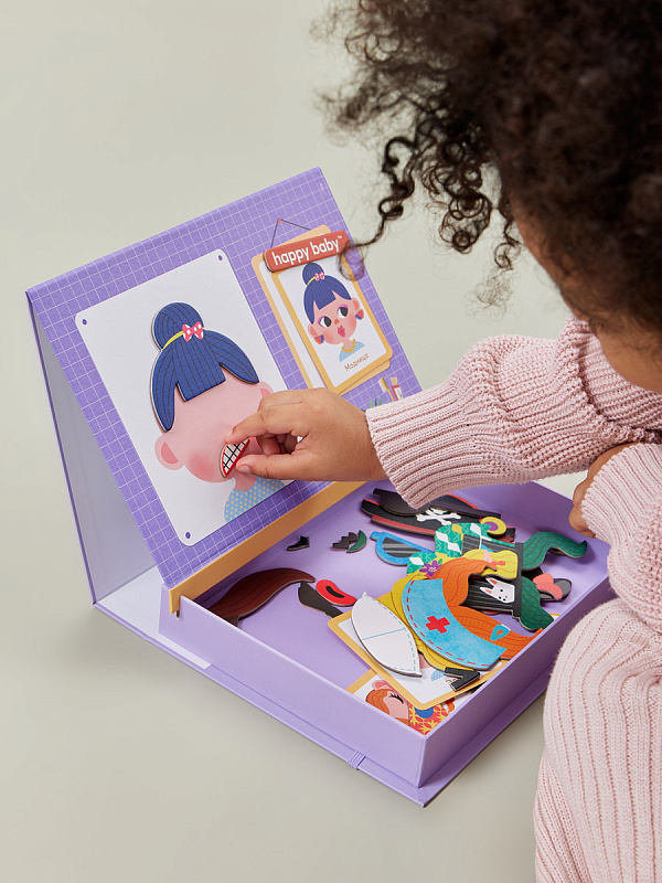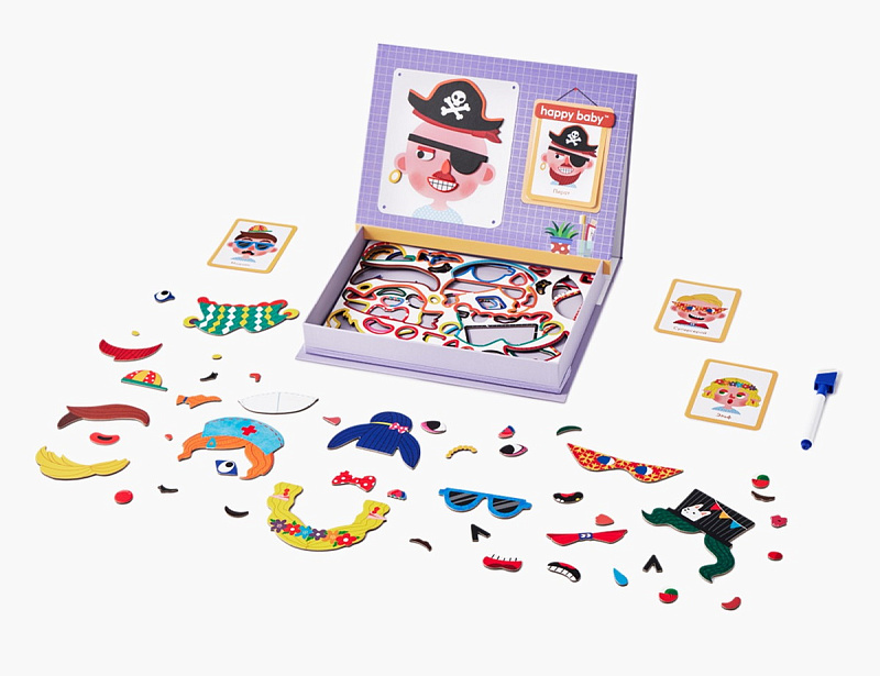 Набор станет замечательным подарком любому ребенку. Цель этой игры - воссоздать портреты с помощью имеющихся элементов. Магнитный пазл развеселит и увлечет малыша. Создавайте забавные лица, смейтесь вместе и помогайте малышу развиваться. Все элементы набора имеют магнитную основу, легко крепятся к магнитной доске. Набор развивает мелкую моторику, воображение, цветовое восприятие и эмоциональный интеллект. Игрушку удобно брать с собой в поездки – все детали хранятся в коробке и никуда не выпадут во время творческого процесса.