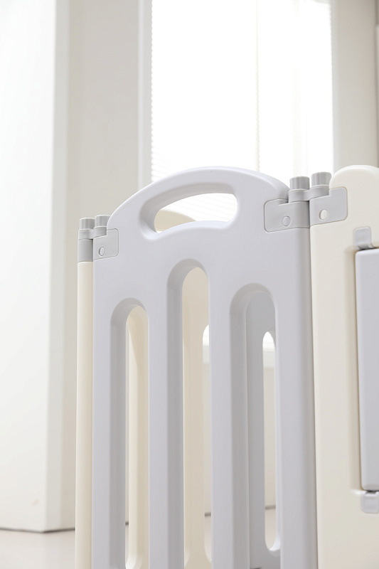 Конструкция пластикового манежа для новорожденных 0+ включает секции, которые снабжены надёжными присосками, обеспечивающими дополнительное сцепление с поверхностью пола, предотвращая скольжение.