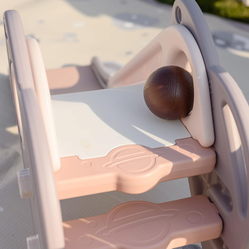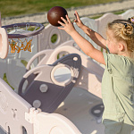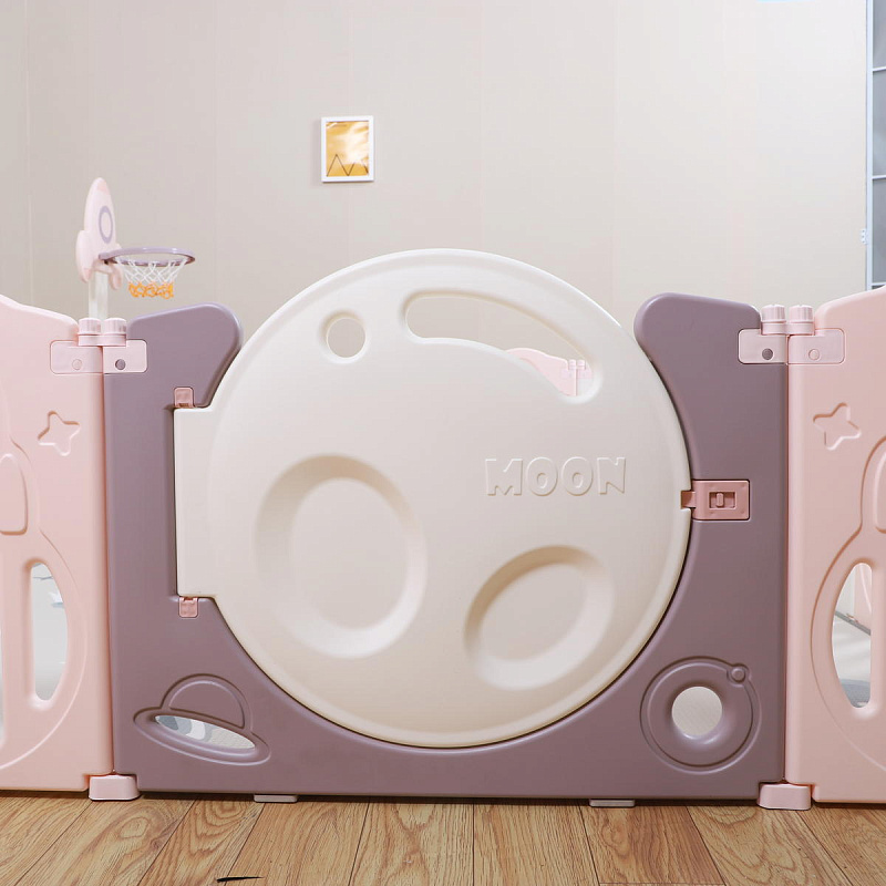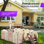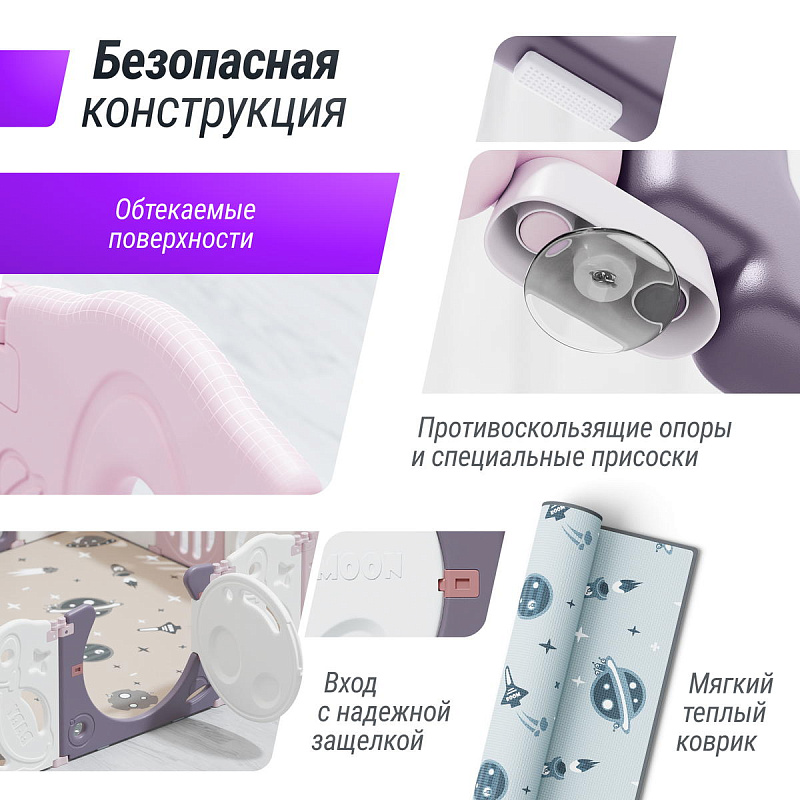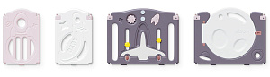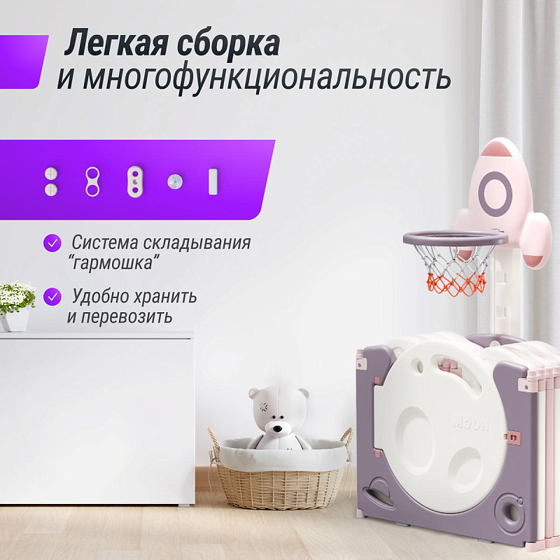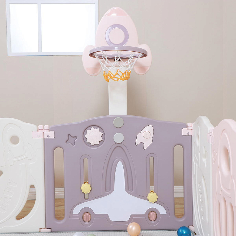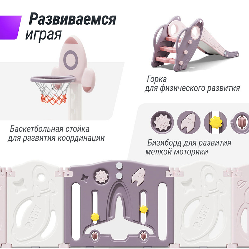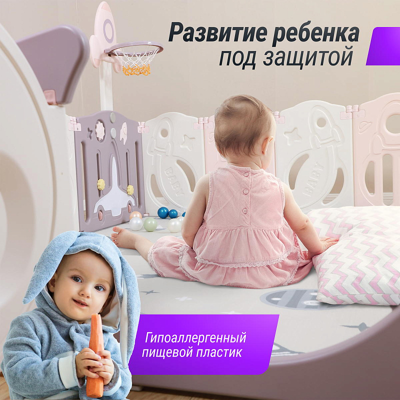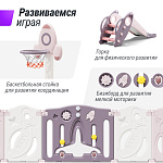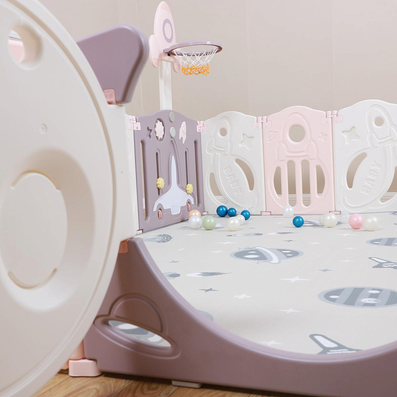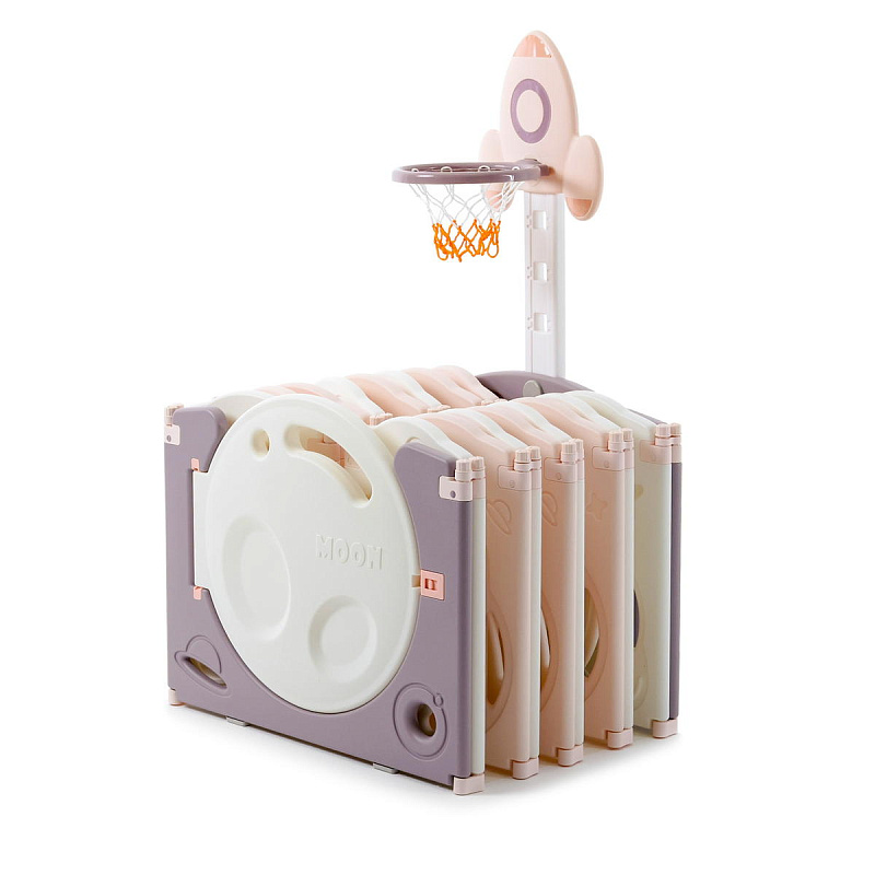 Высота секций 63 см. Секции изготовлены из гипоаллергенного пластика. С манежем в комплекте идут: баскетбольная стойка, бизиборд, горка, коврик, шарики.