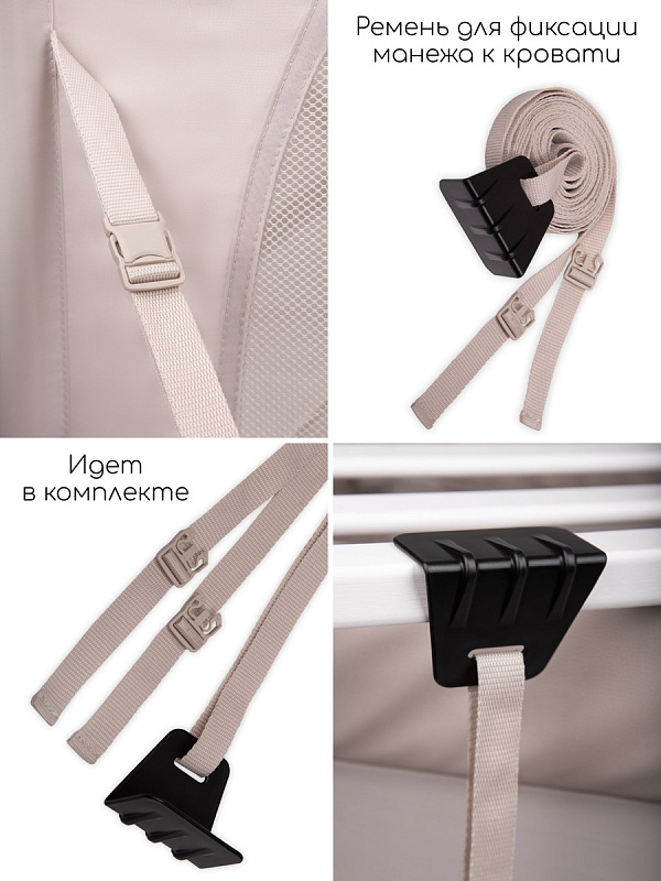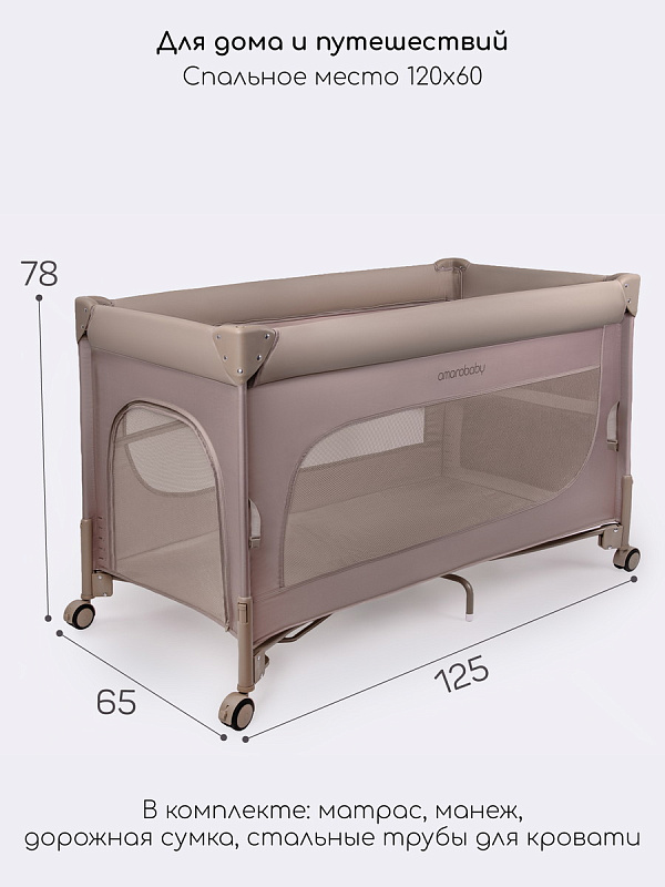 Вся кроватка легко перемещается по дому благодаря четырем прорезиненным поворотным колесам, которые вращаются на 360 градусов и не оставляют следов на полу, причем каждое колесо оснащено надежным фиксатором. Бортик манежа обтянут экокожей, что не только придает ему элегантный внешний вид, но и обеспечивает легкий. В комплекте предусмотрен матрасик, удобная сумка-переноска и фиксирующий ремень.