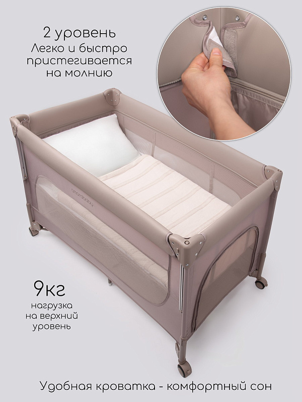 Нижний ярус предназначен для детей до 3 лет или весом до 15 кг, предоставляя им просторное место для игр и отдыха. Для самых маленьких, новорожденных до 6 месяцев или весом до 9 кг, предусмотрен верхний ярус – уютная кроватка размером 120*60 см. Высота манежа регулируется, позволяя адаптировать его под ваши нужды, а откидной бортик облегчит доступ к ребенку. Для дополнительного комфорта и порядка предусмотрены удобные кармашки для мелочей, а с противоположной стороны – боковой лаз, который позволит подросшему малышу самостоятельно исследовать мир.