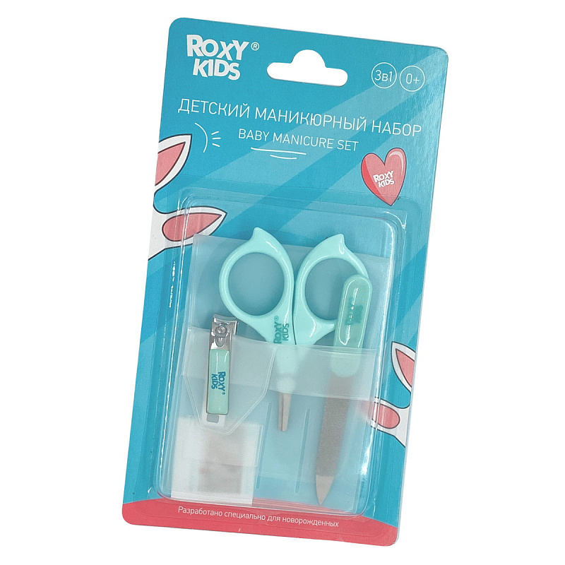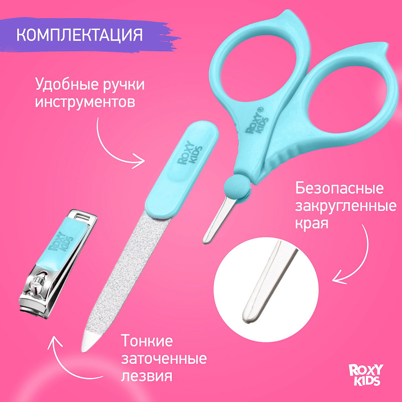 Маникюрный набор для новорожденных и малышей 3в1 от ROXY-KIDS поможет полноценно ухаживать за первыми ноготочками малыша. Детские ножницы, пилочка и кусачки от созданы специально для того, чтобы ухаживать за ручками и ножками малышей с первых дней жизни. Они совсем маленькие, но тщательно продуманы для того, чтобы стрижка ногтей была максимально удобной и безопасной. К примеру, у ножниц закруглены концы, чтобы в случае, если ребенок сделает резкое движение, они не поранили его. А лезвия из металла очень тонкие, чтобы процесс был оптимально мягким.