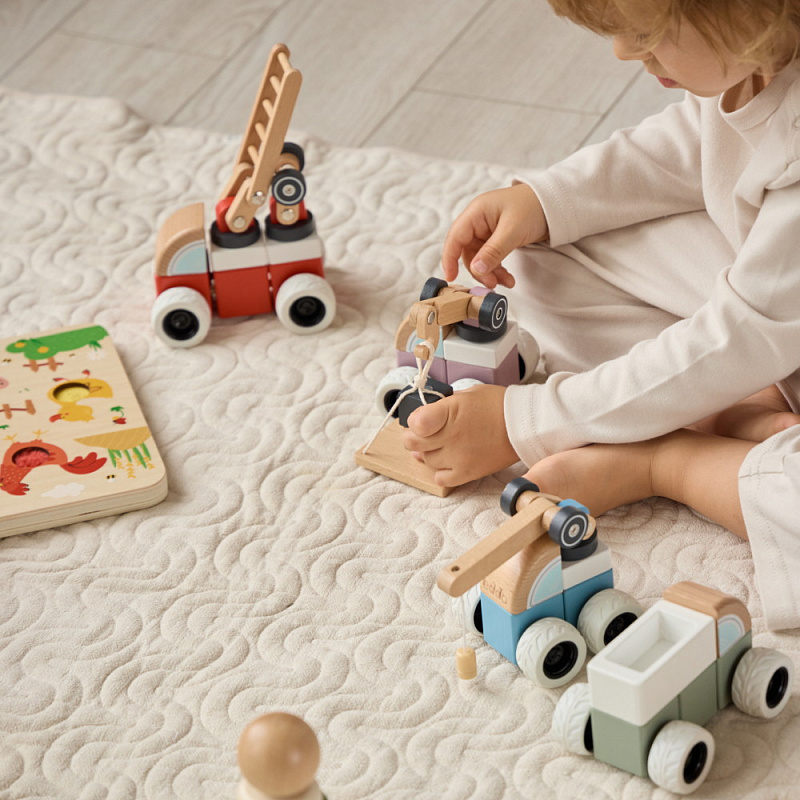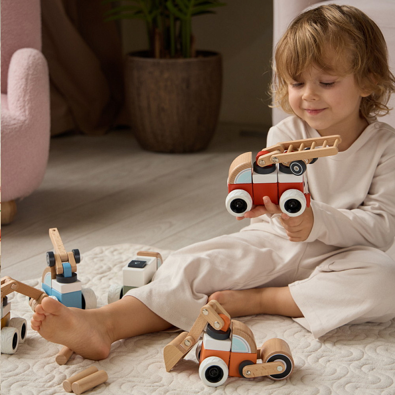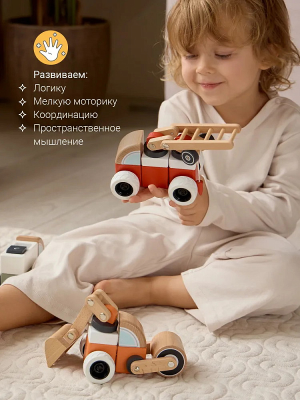 - Соберите «Мини-автопарк» — в серии представлены 6 машинок-конструкторов с разными ролями, например, пожарная машина и грузовик, позволяя играть машинками вместе в едином сюжете.
