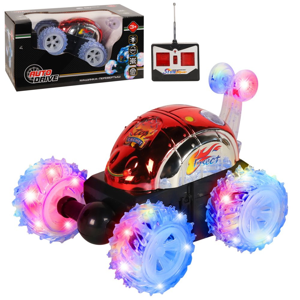 Машинка-перевертыш AUTODRIVE на радиоуправлении с пультом. Машинка-перевертыш на радиоуправлении выполняет невероятные трюки: разворачивается на 360 градусов, переворачивается через себя и продолжает движение, сверкая яркими огнями!Колеса выполнены из прозрачного материала, светятся изнутри, что особенно эффектно выглядит в темноте.