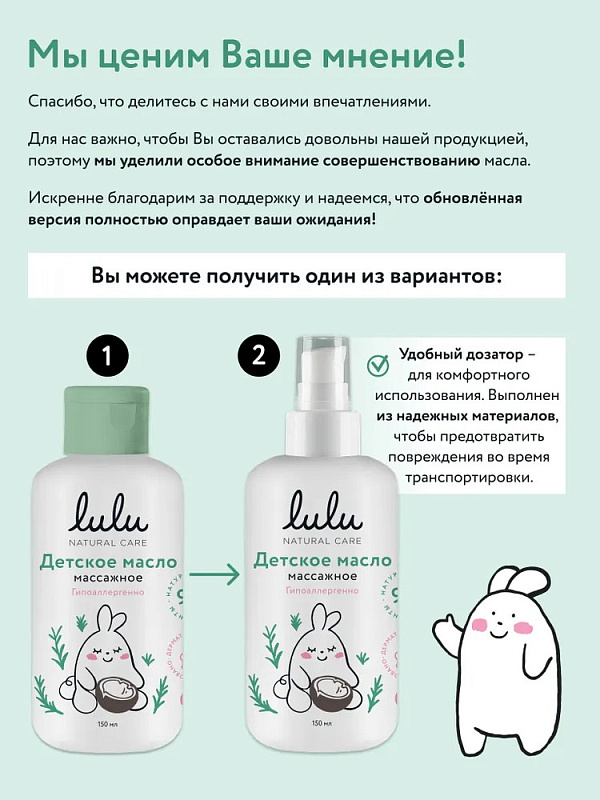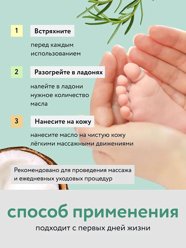 Массажное масло LULU состоит на 99% из натуральных ингредиентов и содержит комплекс натуральных масел, которые смягчают, увлажняют и питают кожу малыша, предотвращая повышенную сухость и шелушение. Масло детское для массажа от LULU разработано специально для нежной и чувствительной детской кожи. Входящие в состав масла компоненты, в виде Витамина Е и экстракта розмарина оказывают антиоксидантное действие, защищают кожу от неблагоприятных факторов внешней среды и помогают укрепить защитные свойства кожи. Масло для новорожденных подходит для детей с первых дней жизни 0+, а специально подобранный состав делает его безопасным и эффективным средством для регулярного использования. Входящие в состав, масло ши и масло кокосовое для тела — обладают увлажняющими и защитными свойствами, помогают предотвратить потерю влаги кожей и защищают от внешних воздействий. Улучшают кровообращение и обмен веществ в коже. В своём составе детское масло не содержит парфюмерной отдушки, вредных веществ, силиконов и минеральных масел. В состав масла LULU входят:
