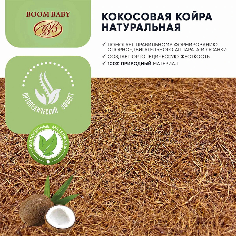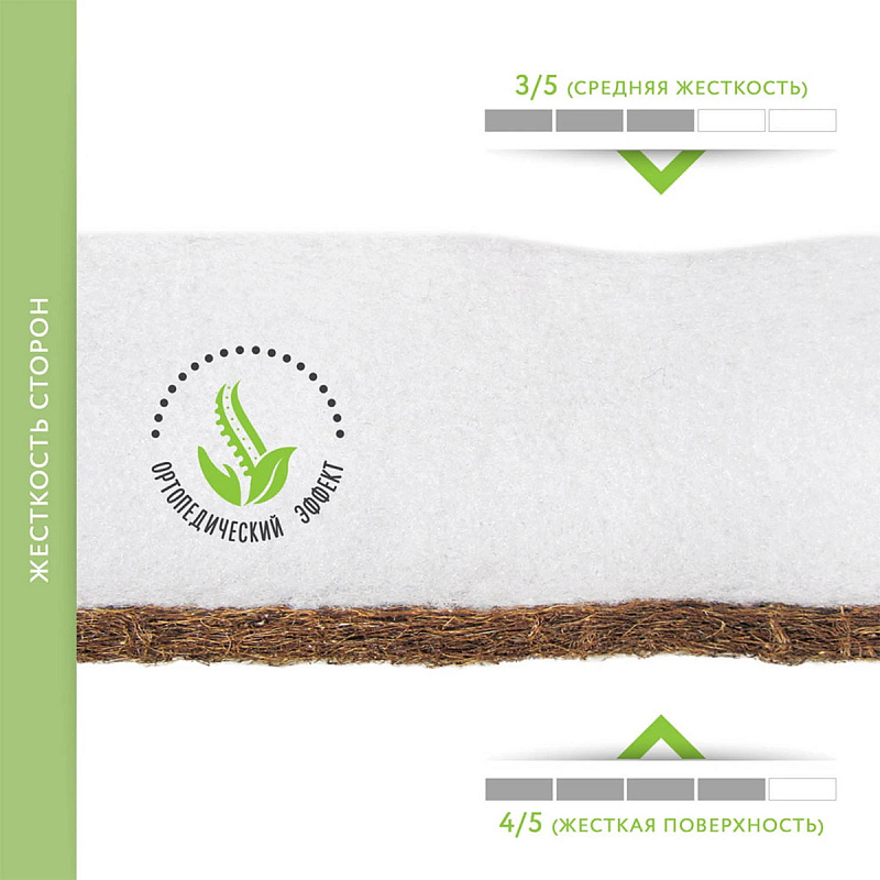 Сторона А: 100% натуральная латексированная кокосовая койра — упругий слой с дополнительными ортопедическими свойствами для правильного формирования позвоночника новорожденного