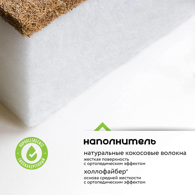 Холлофайбер® и кокосовая койра образуют тандем материалов, который обеспечивает равномерно жесткую поверхность, отличную поддержку и высокую степень воздухопроницаемости. Эти свойства, особенно важные для новорожденных малышей, создают идеальные условия для крепкого и здорового сна.