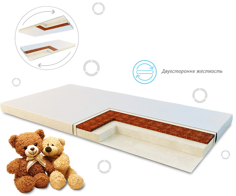 Sweet Baby COCOS Comfort настолько мягкий и комфортный, что сон на нем будет сладким и безмятежным. Сегодня просто нет лучшего наполнителя для детских матрасов, чем кокосовая койра. Это полностью натуральный и гапоаллергенный материал, который просто поражает своими свойствами. Он отлично «дышит», влагоустойчив, не впитывает запах и прекрасно держит форму. Срок его службы исчисляется даже не годами, а десятилетиями. Нетканое волокно HOLLCON используется для изготовления ортопедических матрасов, и оно успело прекрасно зарекомендовать себя на рынке. Благодаря своей структуре, оно полностью адаптируется под анатомические особенности спящего и гарантирует комфортный сон. Кроме того, этот материал невероятно износостойкий и долговечный. Кроме того, это матрас с двухсторонней жесткостью. Более жесткая сторона обычно используется для детей помладше, чтобы обеспечить ортопедическую поддержку позвоночнику и таким образом сопутствовать его правильному развитию. Вторая - более мягкая. Она используется после того, как ребенок немного подрастет. Эта сторона матраса позволит ему чувствовать себя максимально комфортно во время сна.
