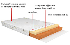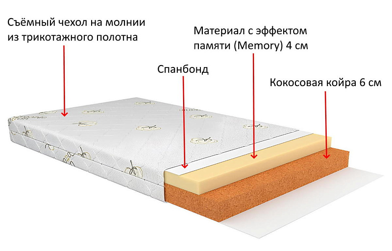 Детский матрас Vikalex Асти 120х60х10 см беспружинный, двусторонний, с разной жесткостью сторон. Одна из сторон – жесткая, вторая имеет среднюю степень жесткости. Матрас состоит из 6 сантиметрового слоя из кокосовой койры, 4-х сантиметрового слоя материала Memory Foam с эффектом памяти и тонкого слоя спанбонда - тонкого нетканого материала, изготовленного из полипропиленового волокна по технологии термоскрепления.