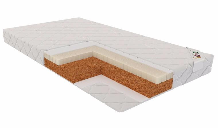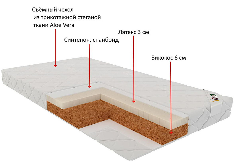 Основой матраса Vikalex Венеция 120х60х10 см является 6-ти сантиметровый слой бикокоса. С другой стороны расположен слой натурального латекса толщиной 3 см. В составе матраса также присутствуют тонкие слои синтепона и спанбонда.