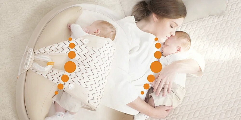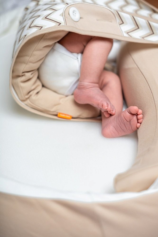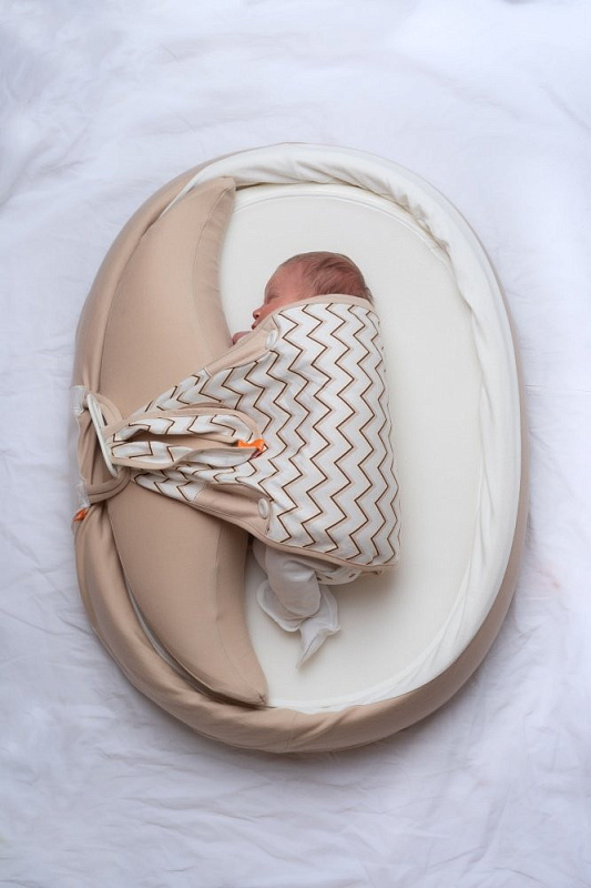 Одеяло-фиксатор с теплым вкладышем и бесшумным замком обеспечивают фиксацию на боку, а подушка-вкладыш имитирует объятия мамы.