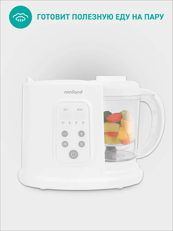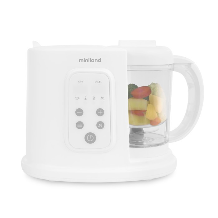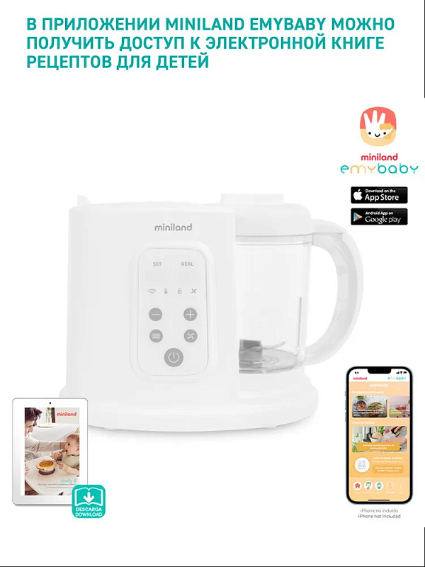 - Через приложение Miniland EmyBaby® можно получить доступ к книге “Рецепты, правильное питание и рацион для детей”, которая содержит практические советы по питанию детей, адаптированные по возрасту, а также рецепты как пюре, так и каш в зависимости от выбранного метода приготовления.
