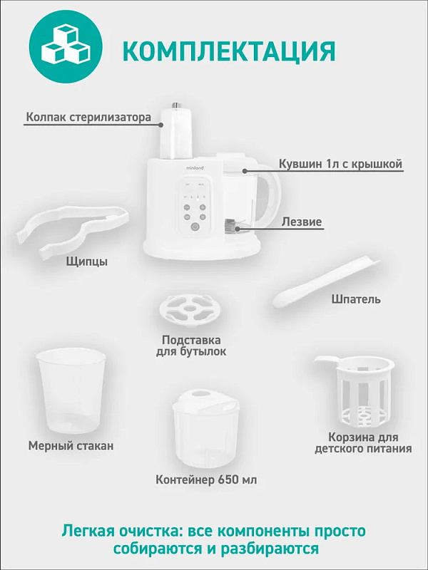 - Легкая очистка, все компоненты легко собираются и разбираются.