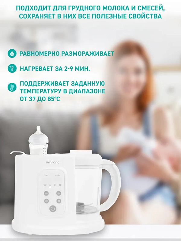 - Подходит для грудного молока и смесей, мягко и равномерно размораживает и нагревает, при этом ни одно полезных свойств не теряется.