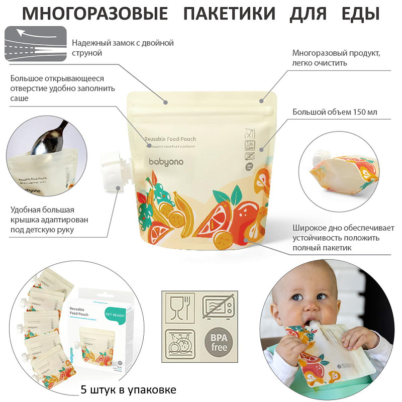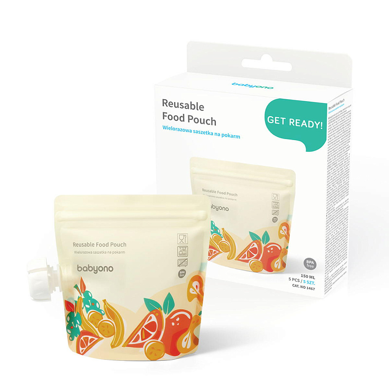 Вы можете использовать наши пакеты для детского питания снова и снова. Их можно легко очищать, а также мыть в посудомоечной машине. В наборе вы найдете 5 пакетиков емкостью 150 мл.