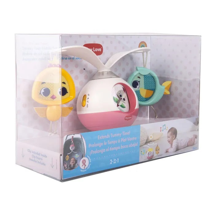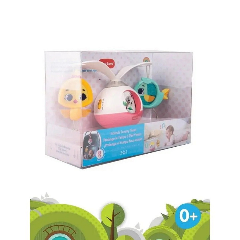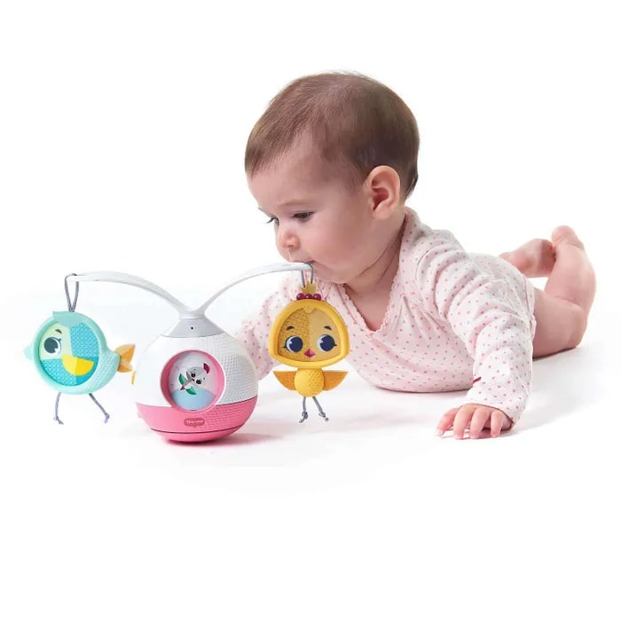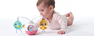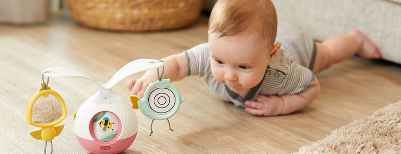 - Положите игрушки на расстоянии от ребёнка (20-25 см.) и дайте ему насладиться музыкой, огоньками и движением подвесок, пока он будет находиться на животике. Это позволит ему проводить время лёжа на животе дольше и с комфортом, что поможет укрепить мышцы спины, шеи и развить крупную моторику.