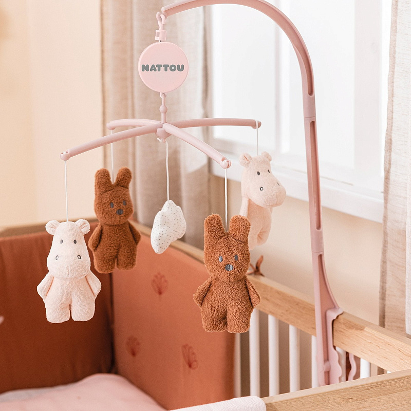 Мобиль Nattou с забавными развивающими игрушками станет одним из первых развлечений малыша – мобиль удобно крепится на бортик, поможет заинтересовать ребёнка или убаюкать его перед сном. Симпатичные и нежные на ощупь, издающие различные звуки, игрушки мобиля Nattou выполняют серьёзные функции, помогая в интеллектуальном и физическом развитии новорождённого:
