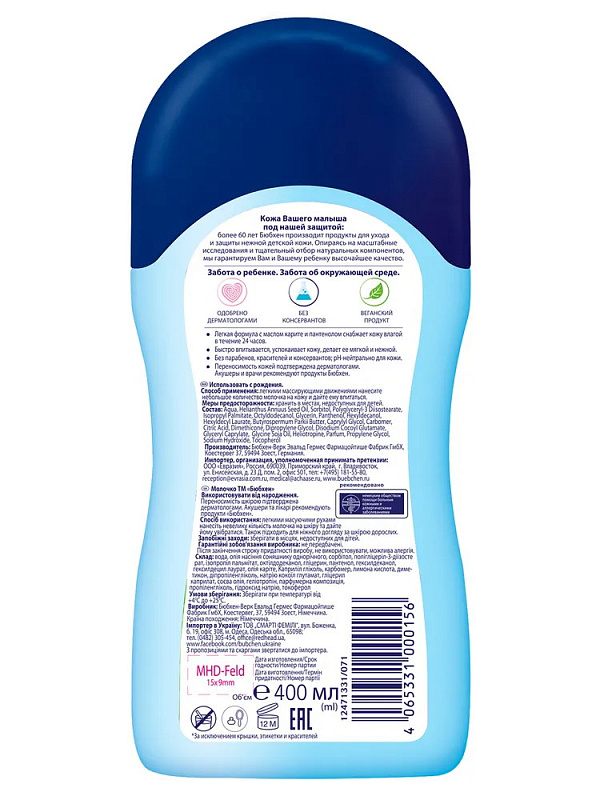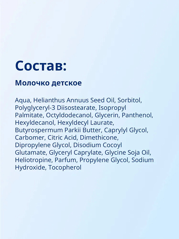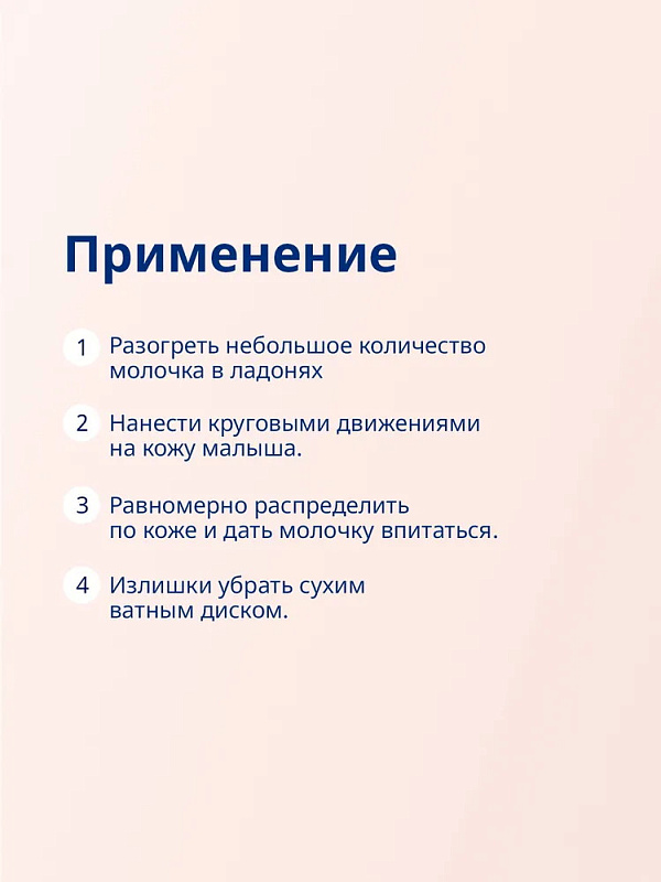 Легкая формула с маслом карите и пантенолом снабжает нежную детскую кожу влагой в течение 24 часов. Молочко быстро впитывается, успокаивает кожу и делает ее мягкой и эластичной.