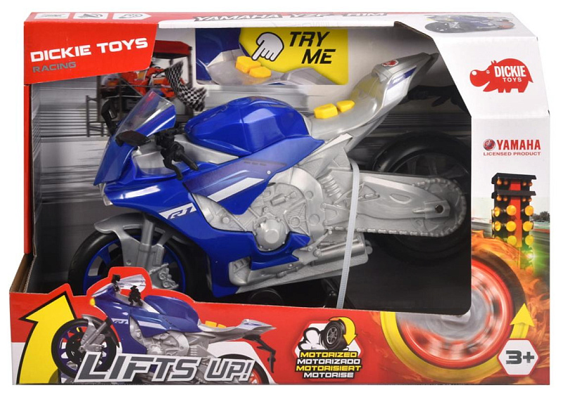 Мотоцикл Yamaha R1 от Dickie Toys изготавливается со всеми подробными характеристиками известной модели мотоцикла. Дизайн вдохновлен Yamaha. Впечатляющий игрушечный мотоцикл оснащен моторизированным ходом, функцией поднятия на одно колесо, световыми и звуковыми эффектами.
