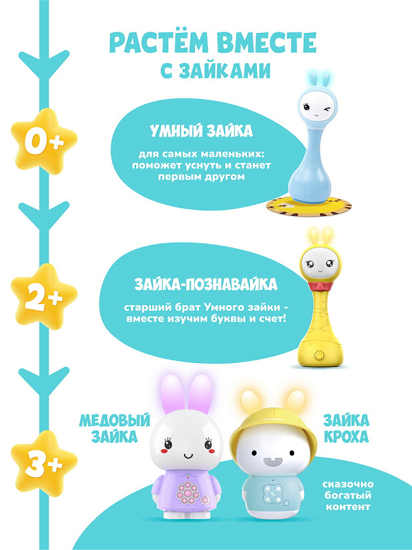 Меня зовут Умный Зайчик alilo, и я незаменимый помощник для мамы и лучший друг для малыша. Я познакомлю малыша с миром звуков и цветов, буду рассказывать сказки и стишки, петь песенки и сладкие колыбельные. Уже десятки тысяч родителей считают, что я один из самых лучших и полезных подарков для ребёнка.
