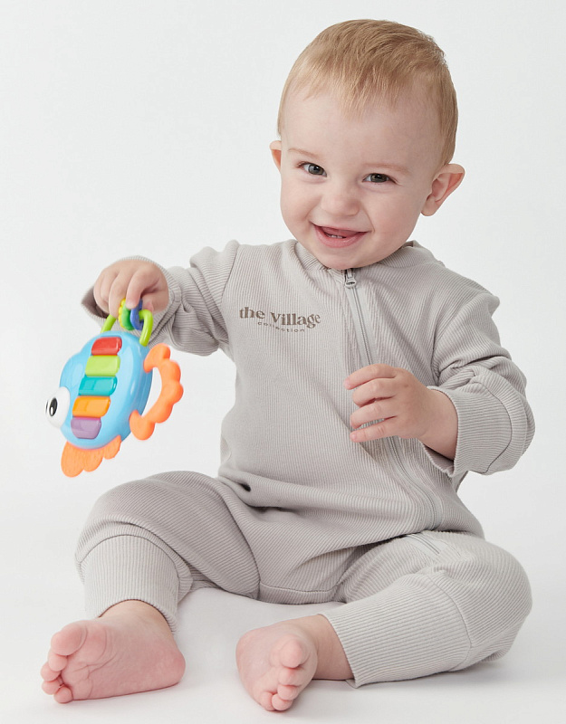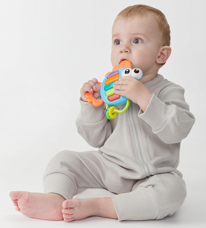 Яркая рыбка PIANO FISH – это интересная музыкальная игрушка и одновременно детский прорезыватель для первых зубов. Многофункциональность игрушки позволяет использовать её на разных этапах развития ребенка. В период прорезывания зубов рыбка поспешит на помощь малышу! Мягкие хвостик и плавничок с рельефной поверхностью идеально подойдут для массажа дёсен, устраняя их отёчность и усиливая циркуляцию крови. Игрушка поможет не только «почесать» дёсны, но будет ещё и отвлекающим фактором для малыша.