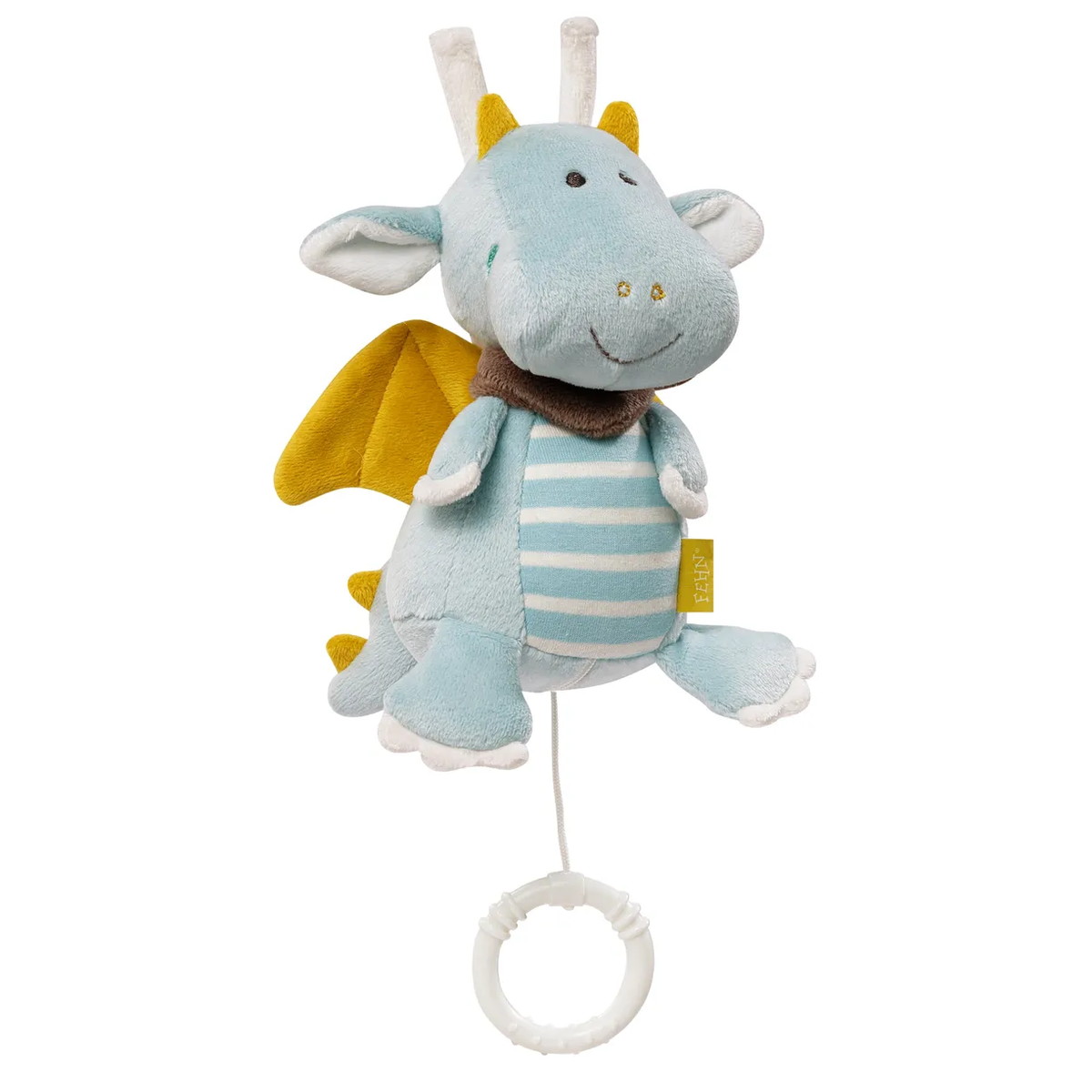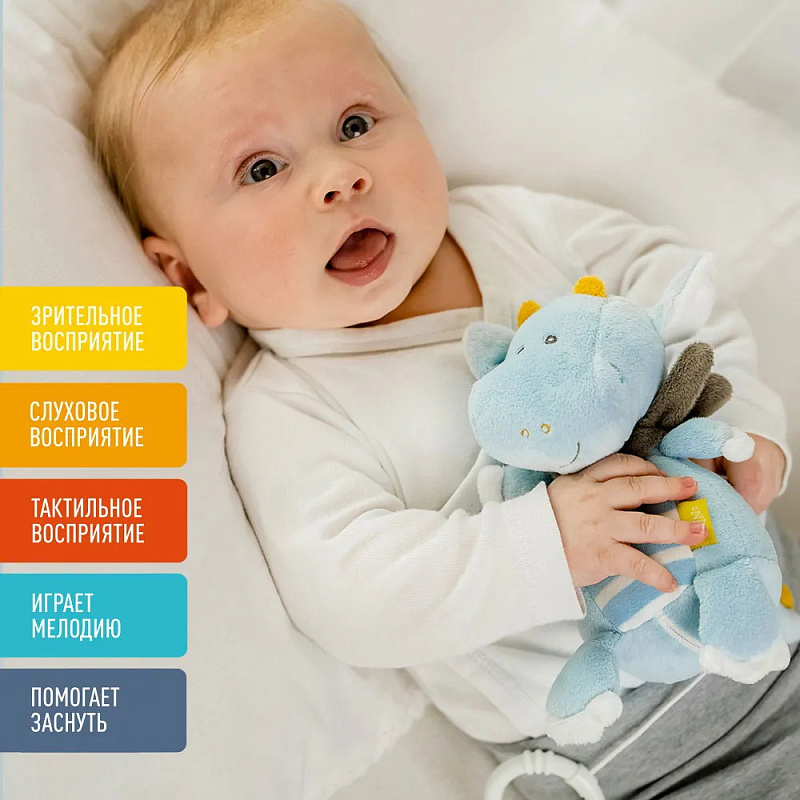 Дракончик очень приятный на ощупь – с ним здорово обниматься и играть. Музыка включается, если потянуть за колечко. Игрушка развивает хватательные навыки, тактильное восприятие, зрение и слух ребенка.