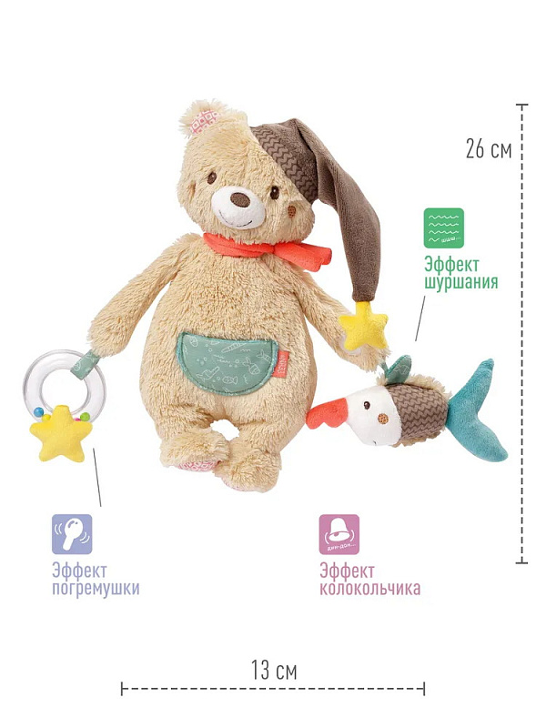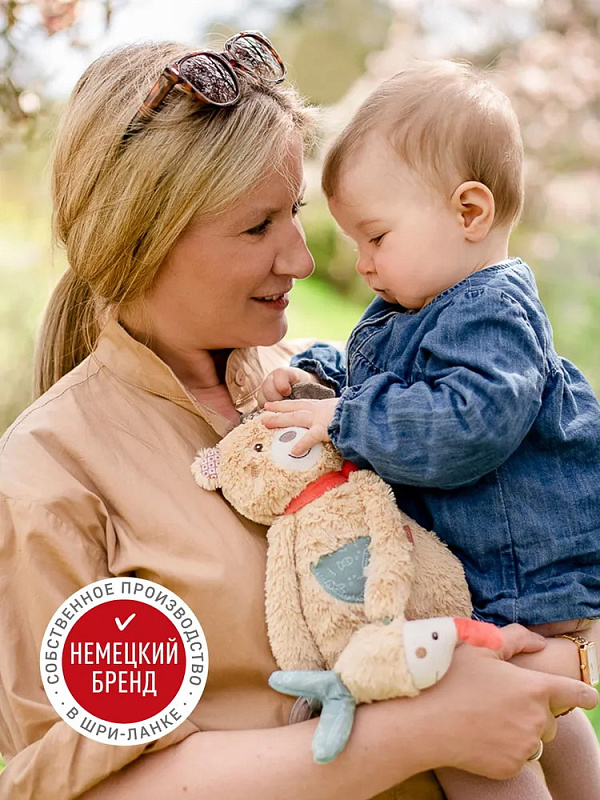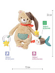 С помощью удобных завязок Бруно можно прикрепить к кроватке, автокреслу или ручке коляски. Механическая музыкальная система спрятана внутри игрушки. Её легко достать, расстегнув молнию.