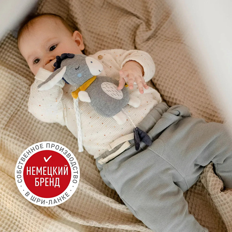 Ослик очень приятный на ощупь – с ним здорово обниматься и играть. Органический хлопок не раздражает чувствительную детскую кожу.