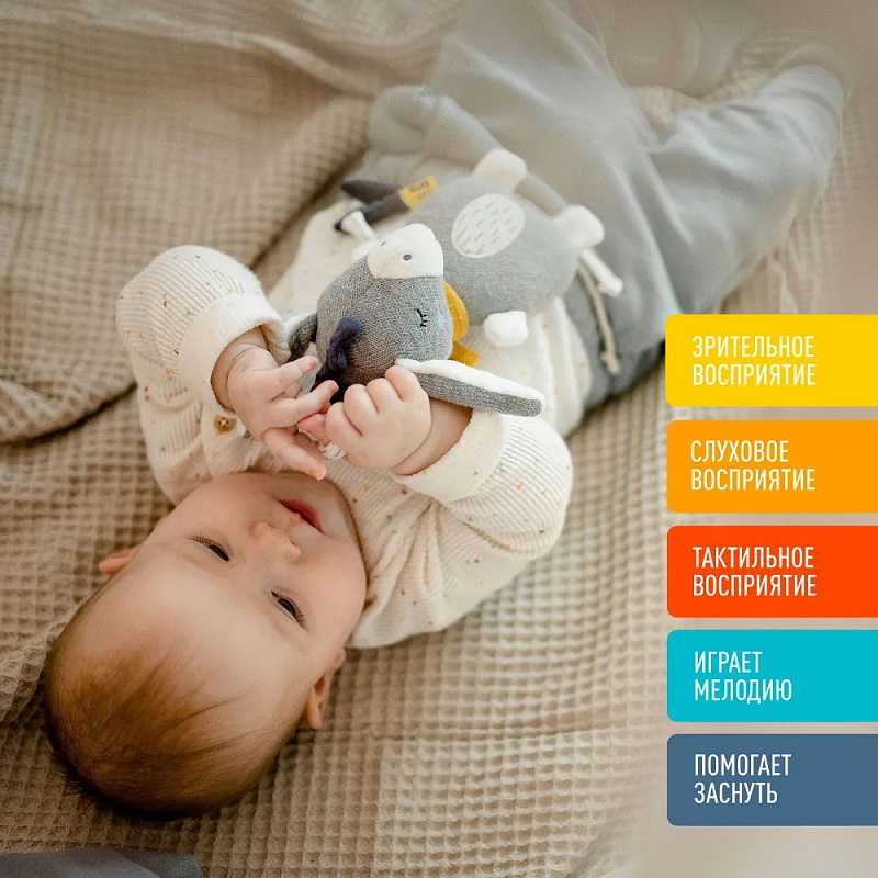 Музыка включается, если потянуть за хвостик. Игрушка развивает хватательные навыки, тактильное восприятие, зрение и слух ребенка.