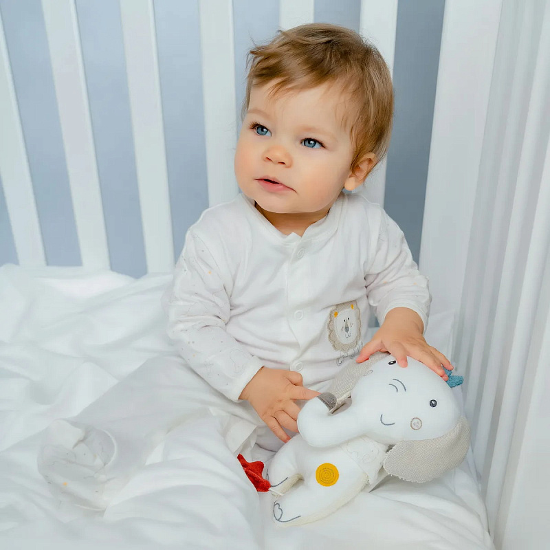 Музыкальная игрушка для засыпания в виде очаровательного слоника, воспроизводящая колыбельную Р. Шумана «Мечты». Приятная громкость расслабляет и убаюкивает маленьких мечтателей. Время воспроизведения около двух минут.