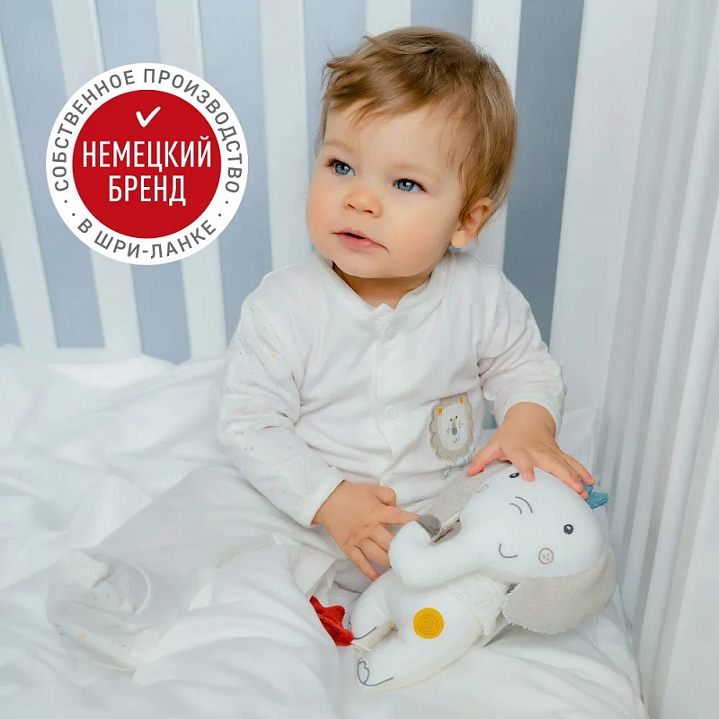 Слоник очень приятный на ощупь – с ним здорово обниматься и играть. Органический хлопок не раздражает чувствительную детскую кожу.