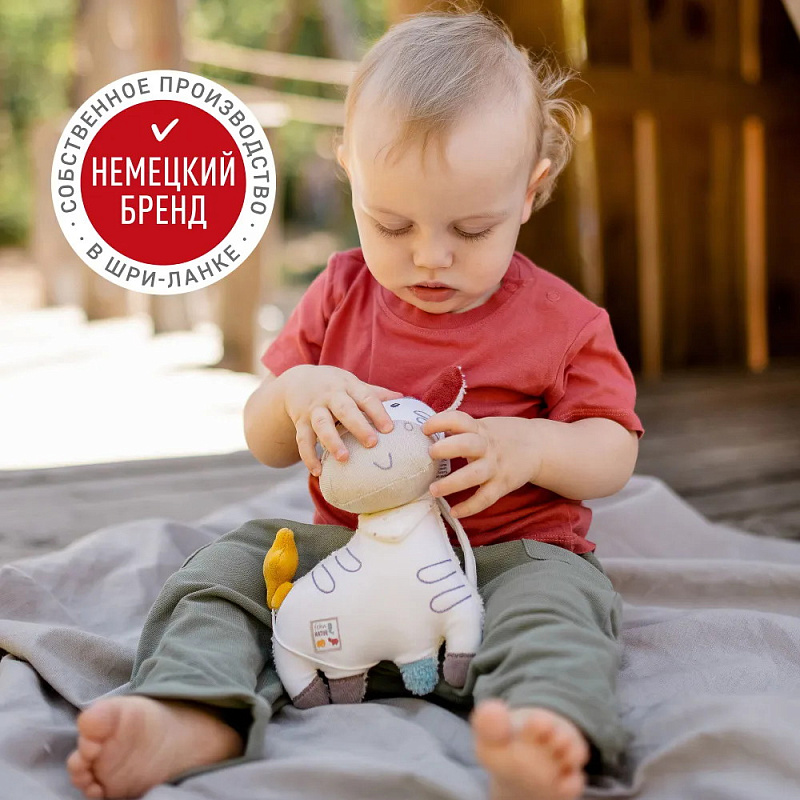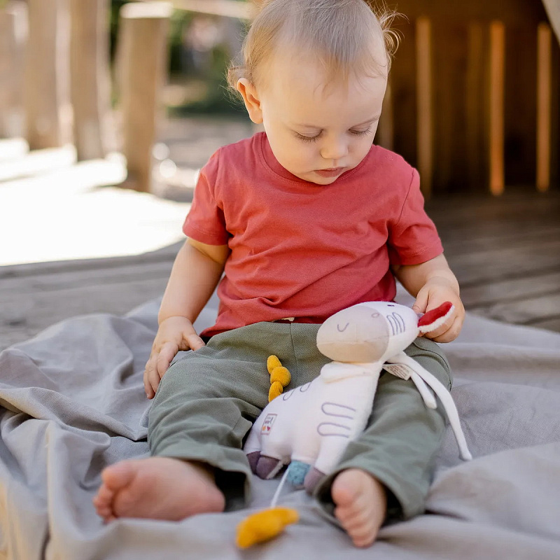 Зебра очень приятная на ощупь – с ней здорово обниматься и играть. Органический хлопок не раздражает чувствительную детскую кожу.