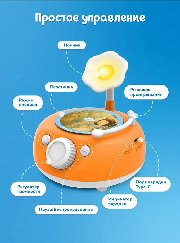 - Уютная подсветка. Мягкий свет превращает граммофон в ночник для комфортного прослушивания сказок перед сном.