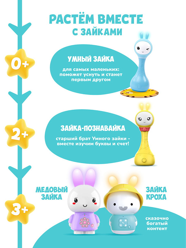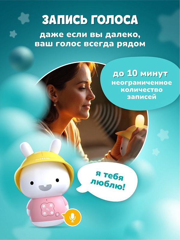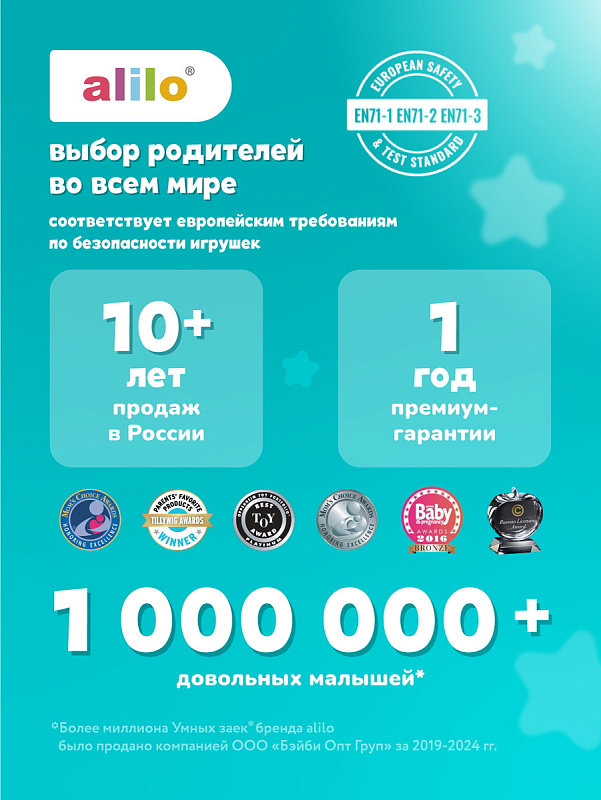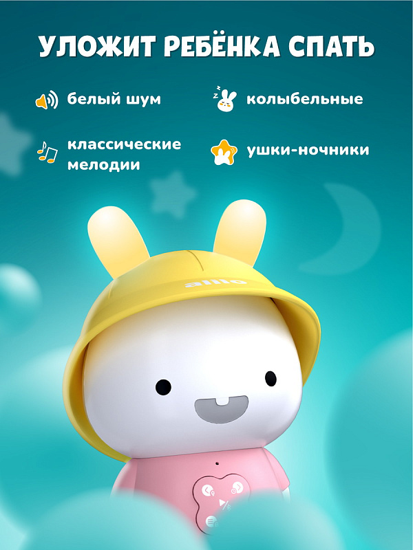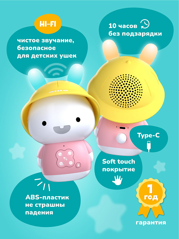 Я Зайка-Кроха Alilo – очаровательный медиаплеер, ночник и верный друг для вашего малыша. На этом моменте снимаю перед вами свою жёлтую шляпку. Со мной можно играть, таскать меня за мягкие ушки. Как и другие зайчики из семейства Alilo, я умею читать сказки и петь песенки. Мои ушки будут светиться мягким светом, когда вам нужен ночник. Мои кнопки очень легко освоить. Я сильный, потому что сделан из прочного ABS-пластика, который в 30 раз прочнее обычного!