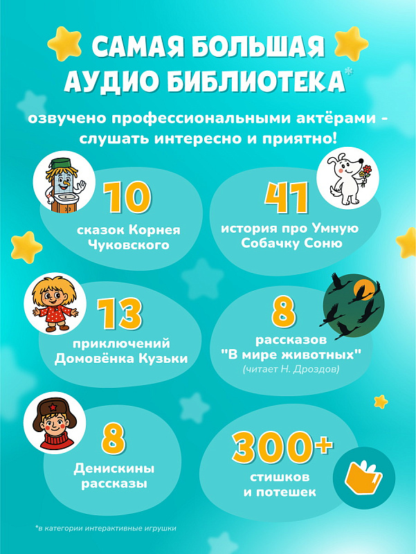 - Добавление в избранное: можно добавить понравившиеся песенки или сказки в избранное.
