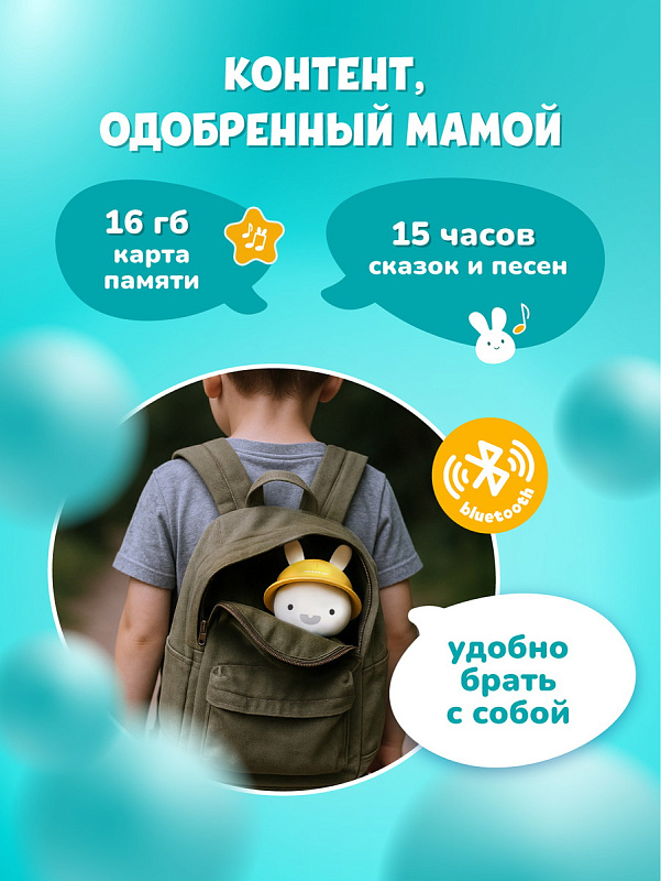 - Многофункциональный: пою песенки и читаю сказки, играю белый шум и музыку для сна, а ещё превращаюсь в ночник!