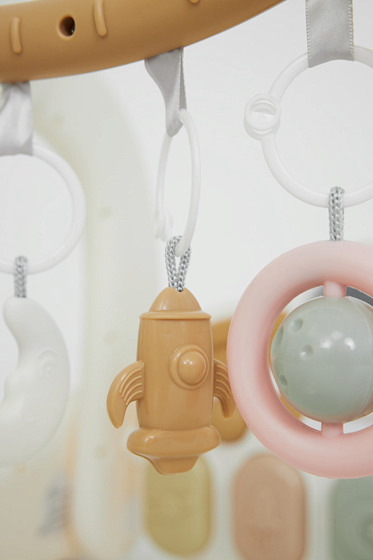 Мягкий развивающий коврик предназначен для игр и комфортного отдыха крохи. Рядом на панели находится ночник с 4-мя режимами подсветки, создающий уютную атмосферу для сна и расслабления. Подвесные игрушки погремушки (мобиль) привлекают внимание новорожденного, стимулируя зрительное и тактильное восприятие. Регулируемая дуга позволяет адаптировать высоту подвешенных игрушек под рост малыша, обеспечивая комфортное взаимодействие с ними.