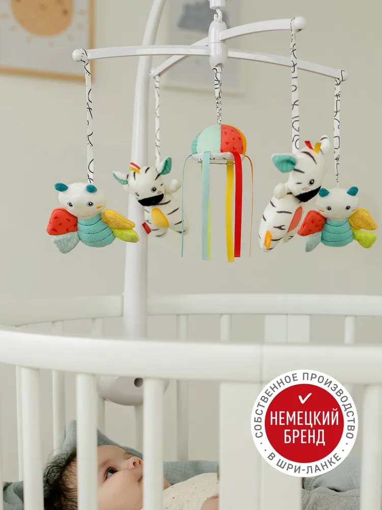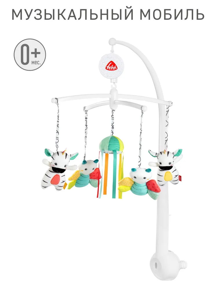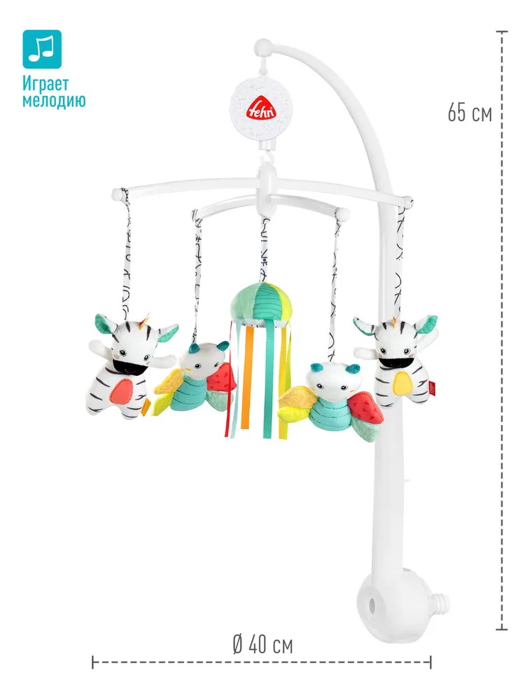 Мобиль легко и надёжно крепится к кроватке. Игрушки медленно кружатся под музыку, привлекая своими деталями и зеркальцем взгляд ребёнка. Подвижные детали помогают развивать зрение и слух, учат малыша концентрировать внимание и стимулируют его воображение.