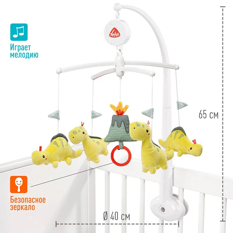 Мобиль легко и надежно крепится к кроватке. Динозаврики Диего и Армандо медленно вращаются под мелодию, увлекая за собой взгляд малыша. Ребенку будет интересно разглядывать фигурки и подвес-зеркальце, тем самым стимулируя воображение и развивая концентрацию внимания.