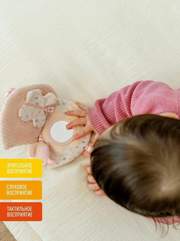 Мягкая книжка с интерактивными деталями познакомит малыша с друзьями птички, обитателями сказочной страны, и надолго его займёт. На каждой из четырёх интерактивных страниц есть свой маленький секрет: зеркальце, шуршалка, пищалка или погремушка.
