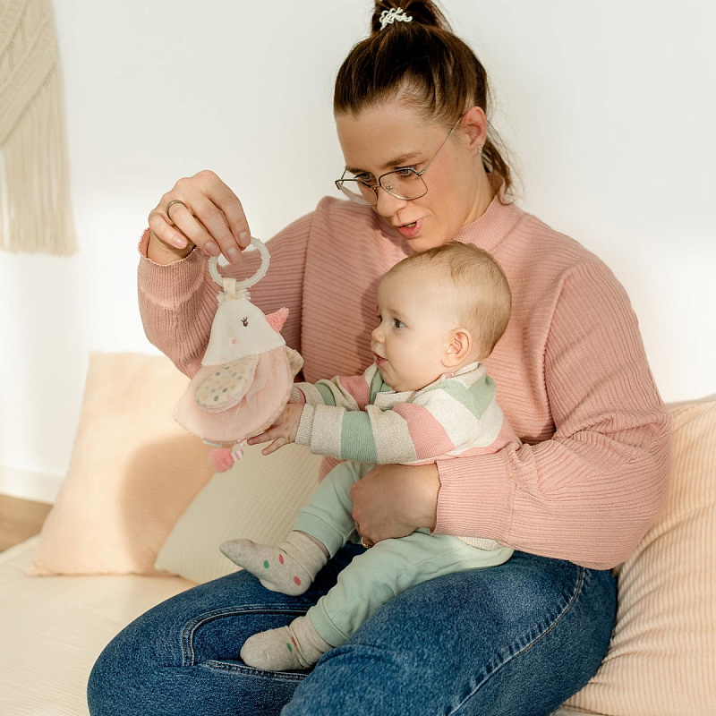 Игрушку с помощью колечка удобно крепить к коляске, кроватке или автокреслу, поэтому милая птичка будет сопровождать малыша повсюду и станет его верным, занимательным другом. Это отличный подарок на рождение малыша или любой другой праздник.
