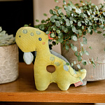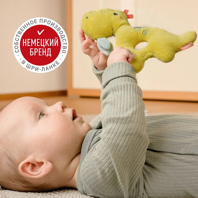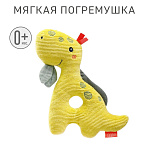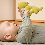 Яркий динозаврик — отличный компаньон для игр: приятная на ощупь ткань, удобное для захвата детской ручкой отверстие, погремушка и шуршащие элементы. Все эти детали пробуждают любопытство и стимулируют двигательную активность малыша, тренируют зрение и слух.