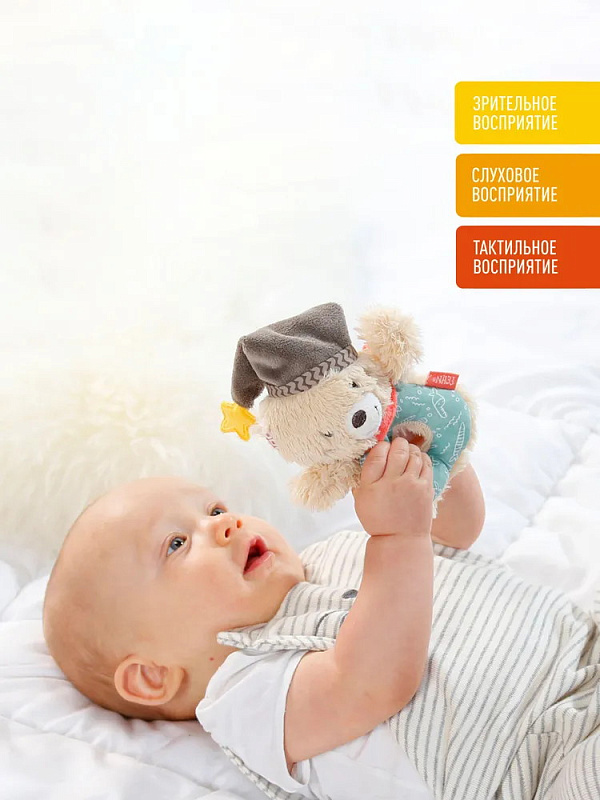 Мягкая погремушка в виде очаровательного медвежонка способствует развитию мелкой моторики, хватательных навыков, слуха и зрения малыша. Фактура ткани стимулирует тактильное восприятие.