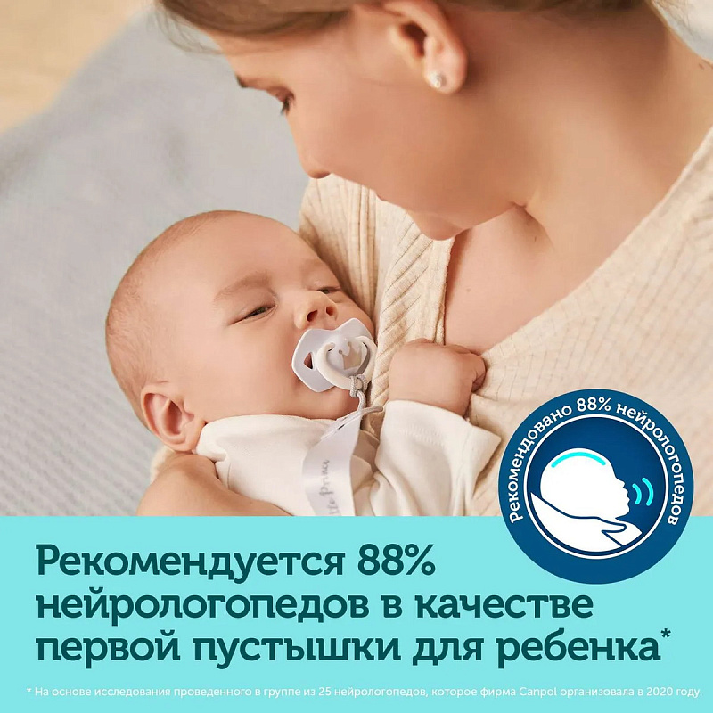Силиконовая пустышка Canpol babies рекомендована специалистами в качестве первой пустышки для вашего малыша. Не влияет на прикус малыша и не нарушает сосательный рефлекс.