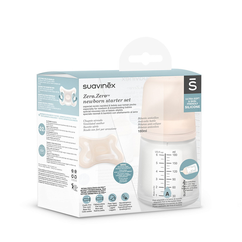 Детская бутылочка для кормления Suavinex Zero.Zero 180 мл с адаптивным потоком разработана для малышей с рождения. Она идеально подходит с первых дней жизни для смешанного кормления (грудным молоком и смесью, либо сцеженным грудным молоком из бутылочки) и искусственного вскармливания детской смесью.