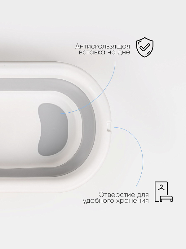 Анатомический вкладыш: Мягкий поддерживающий вкладыш для новорожденных создает дополнительный комфорт и безопасность. Он идеально поддерживает спинку и голову малыша, позволяя родителям уверенно и легко проводить купание без лишних переживаний.