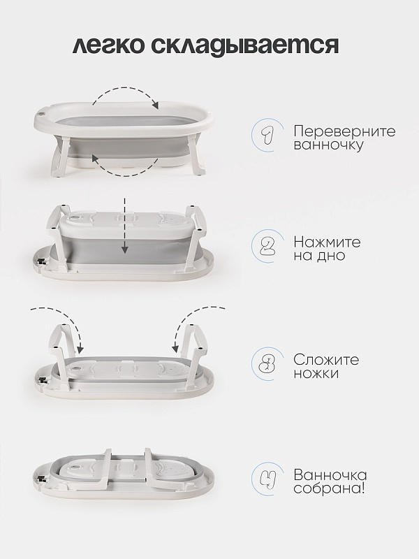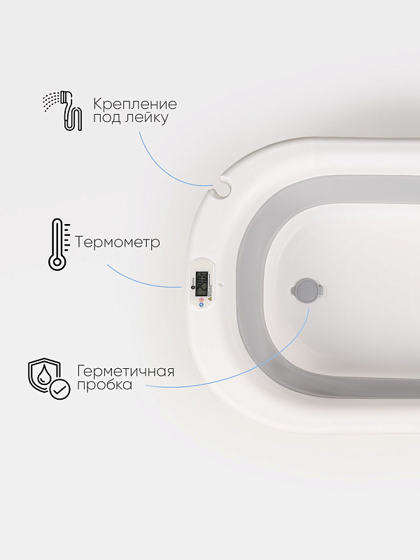 Складная ванночка с термометром: Компактная и устойчивая, она легко раскладывается и складывается одним движением. Встроенный термометр показывает температуру воды, чтобы избежать ожогов и дискомфорта. Идеальна для маленьких ванных комнат и путешествий.