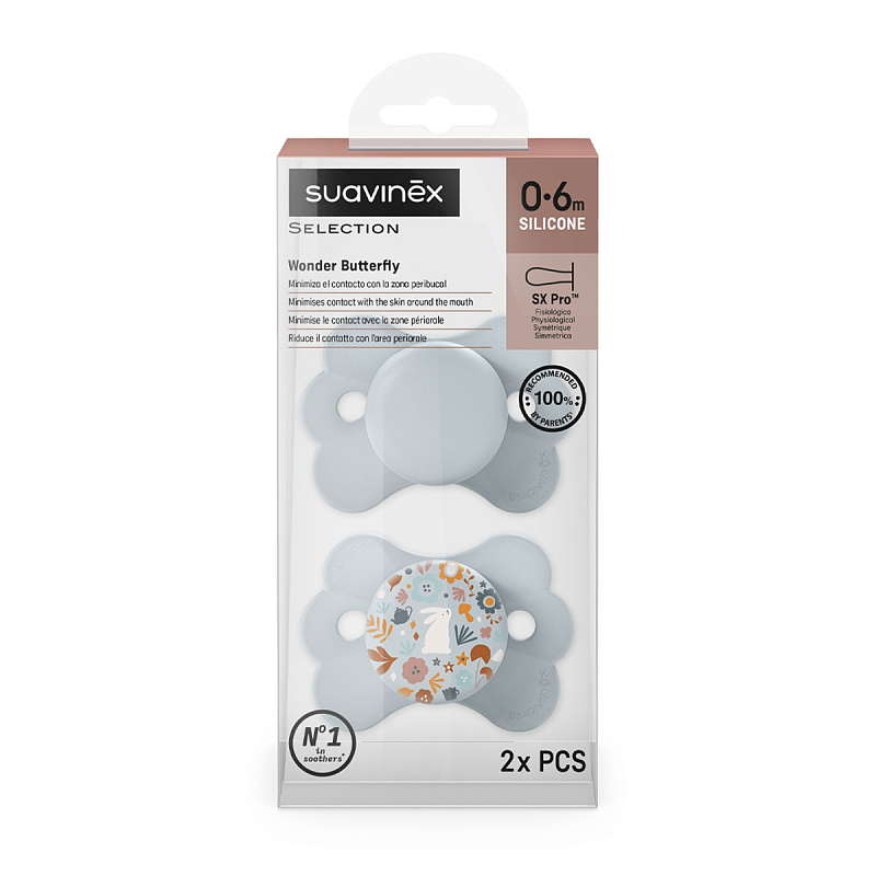 Пустышки выполнены из ультрамягкого силикона с пескоструйной обработкой и имеют плоскую симметричную соску SX Pro, которая анатомически правильно располагается во рту ребенка, не препятствуя естественному развитию ротовой полости и прикуса.